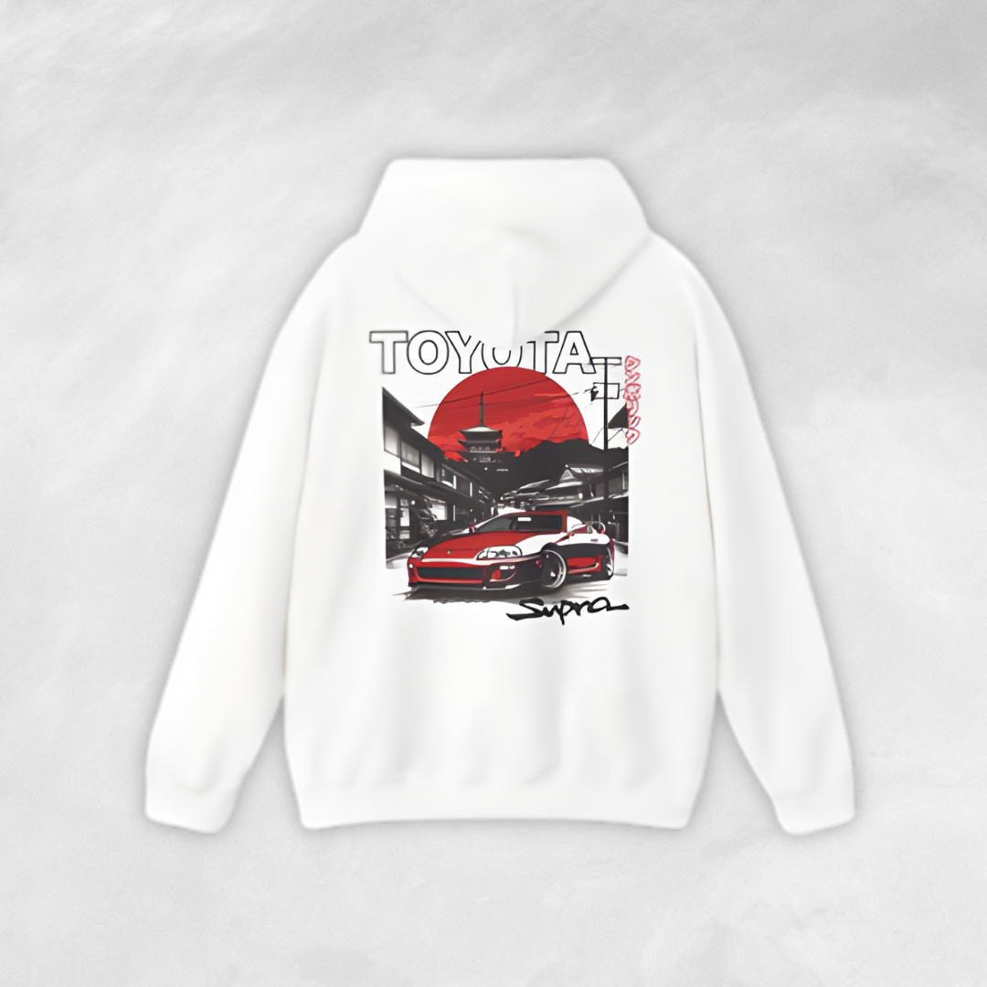 Make a statement with this sleek white hoodie featuring an iconic Toyota Supra graphic design. The back print combines bold red and black tones with a stunning Japanese-inspired cityscape backdrop, creating the perfect fusion of automotive culture and streetwear fashion. Crafted from premium-quality fabric, it offers superior comfort and a relaxed fit for everyday wear.